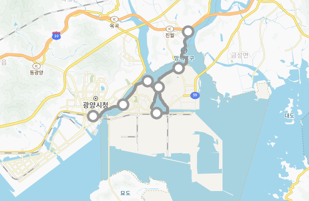 시작점인 전라남도 광양시 중동 1692 대중교통은 광양버스터미널 270번 버스로 강남병원에서 하차하시면 되며 종점인 전라남도 광양시 광양읍 인동리 245 대중교통은 광양버스터미널입니다.